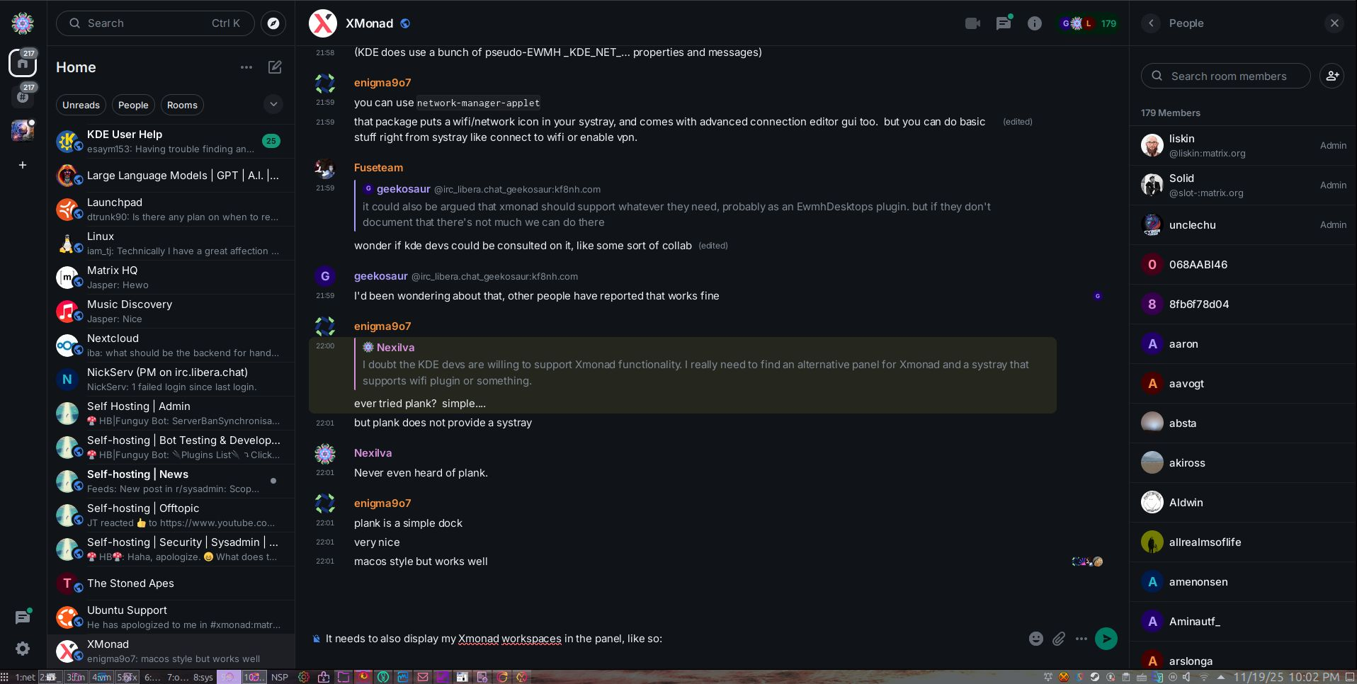 | 2025-11-20 04:56:41 +0100 | <haskellbridge> | <Nexilva> I doubt the KDE devs are willing to support Xmonad functionality. I really need to find an alternative panel for Xmonad and a systray that supports wifi plugin or something. |